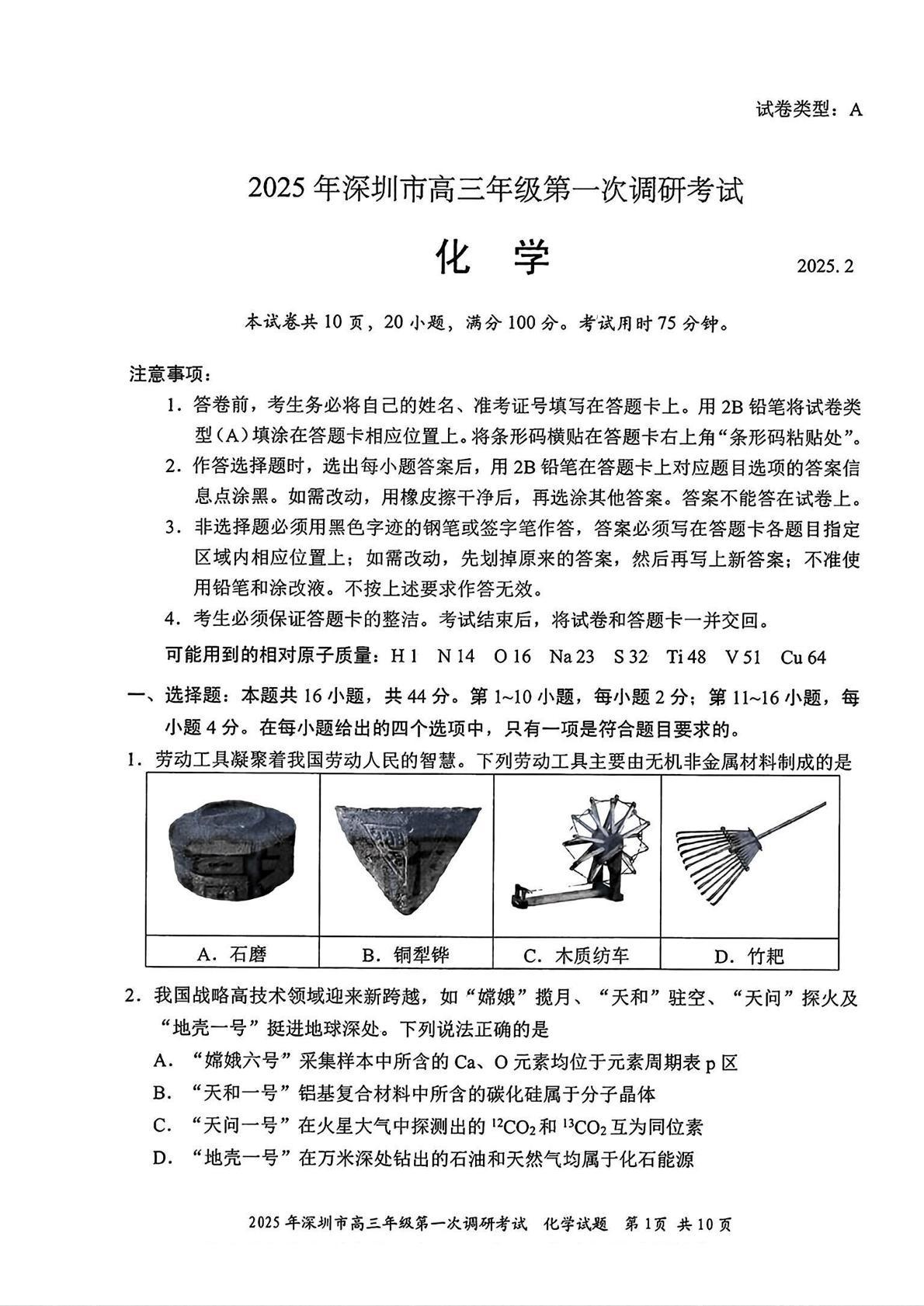广东省深圳市2024-2025下学期高三第一次调研考试(一调)化学+答案
