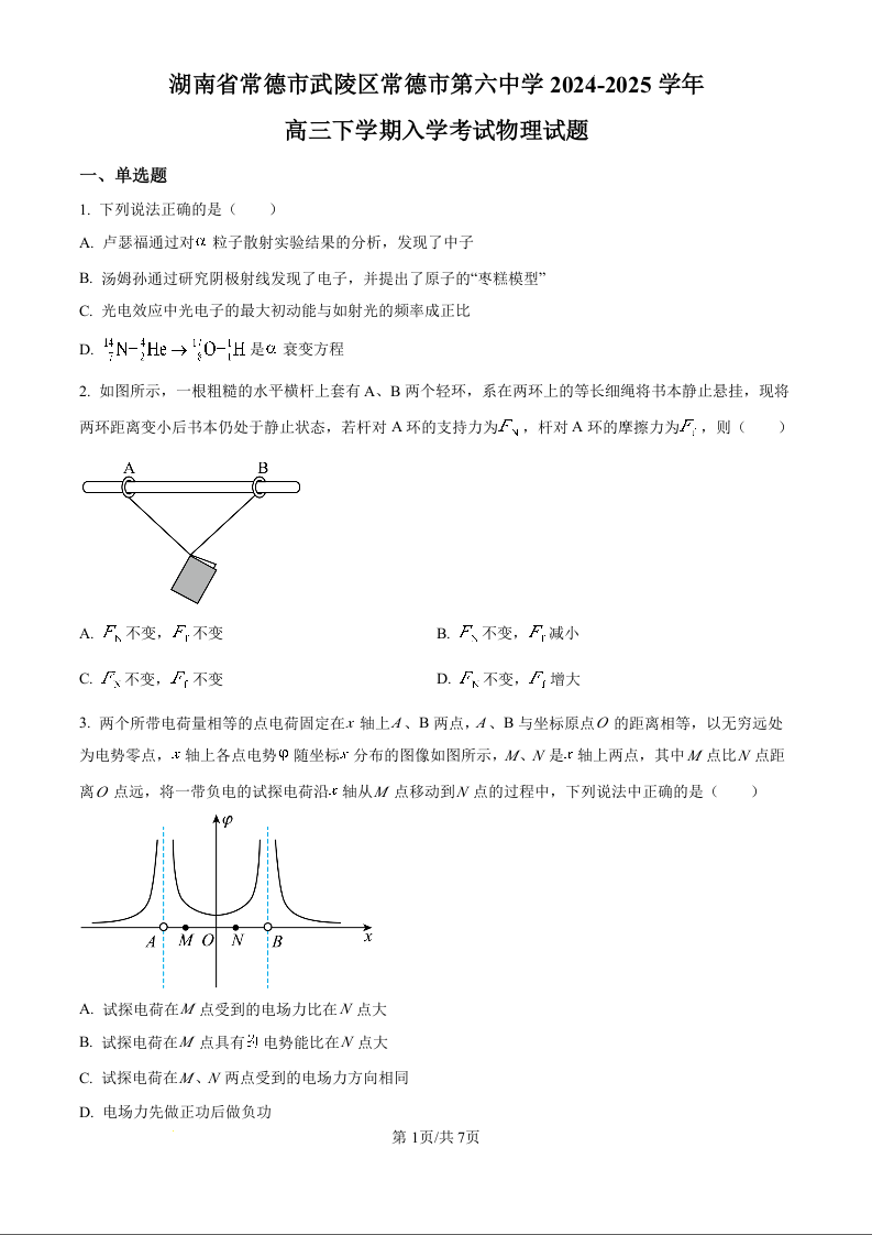 湖南省常德市第六中学2024-2025学年下学期高三开学考试物理(原卷版)