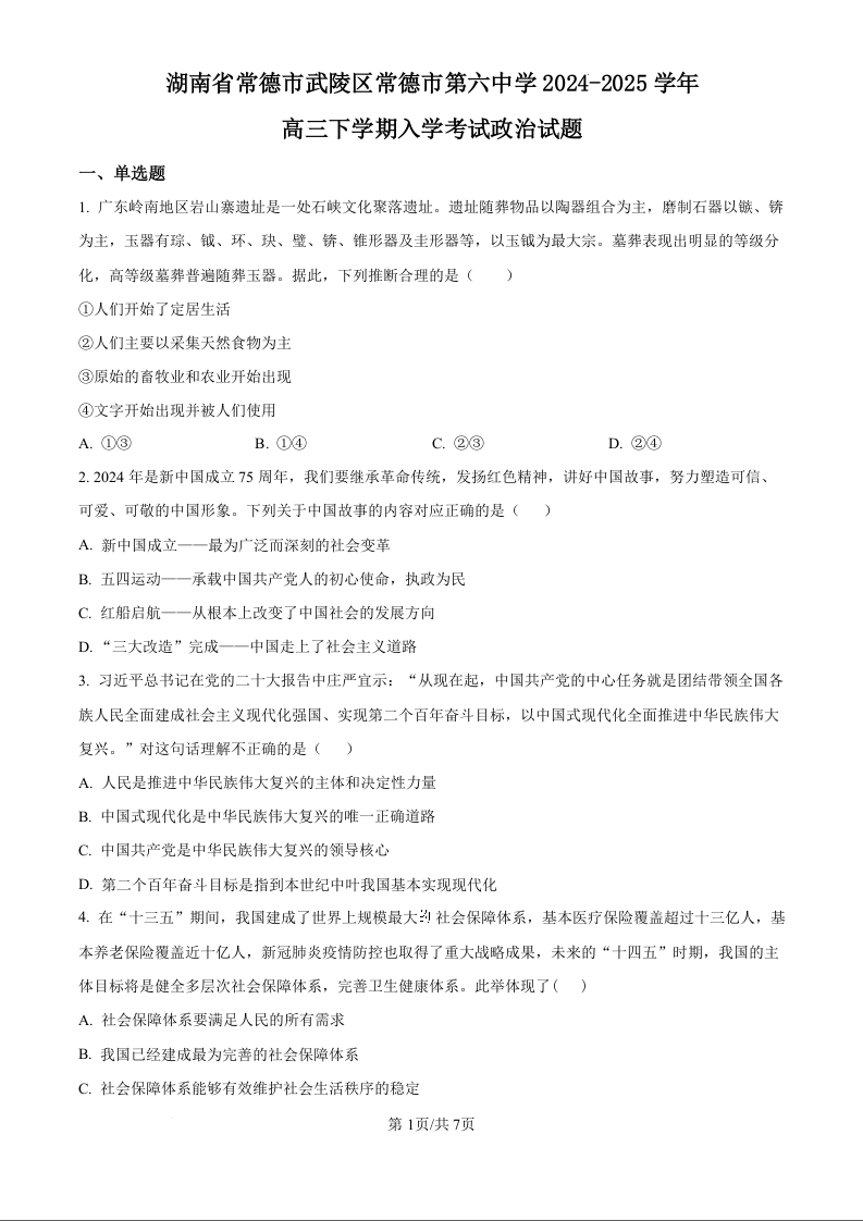 湖南省常德市第六中学2024-2025学年下学期高三开学考试政治(原卷版)