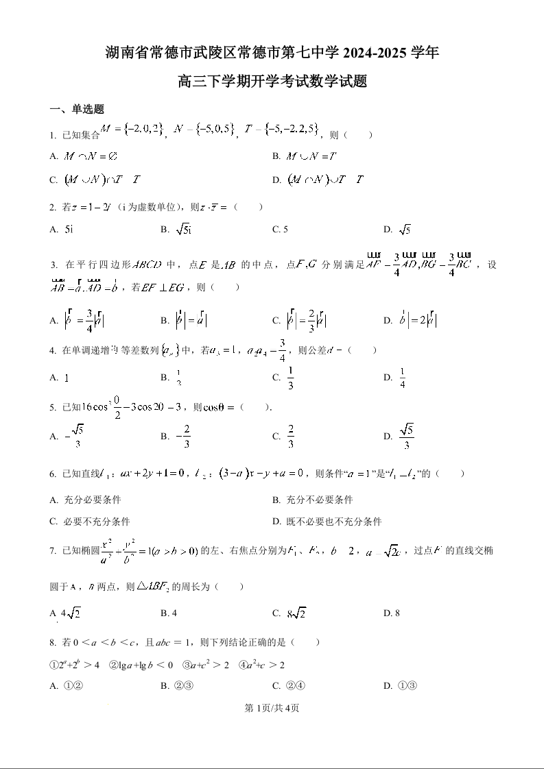 湖南省常德市第七中学2024-2025学年下学期高三开学考试数学(原卷版)