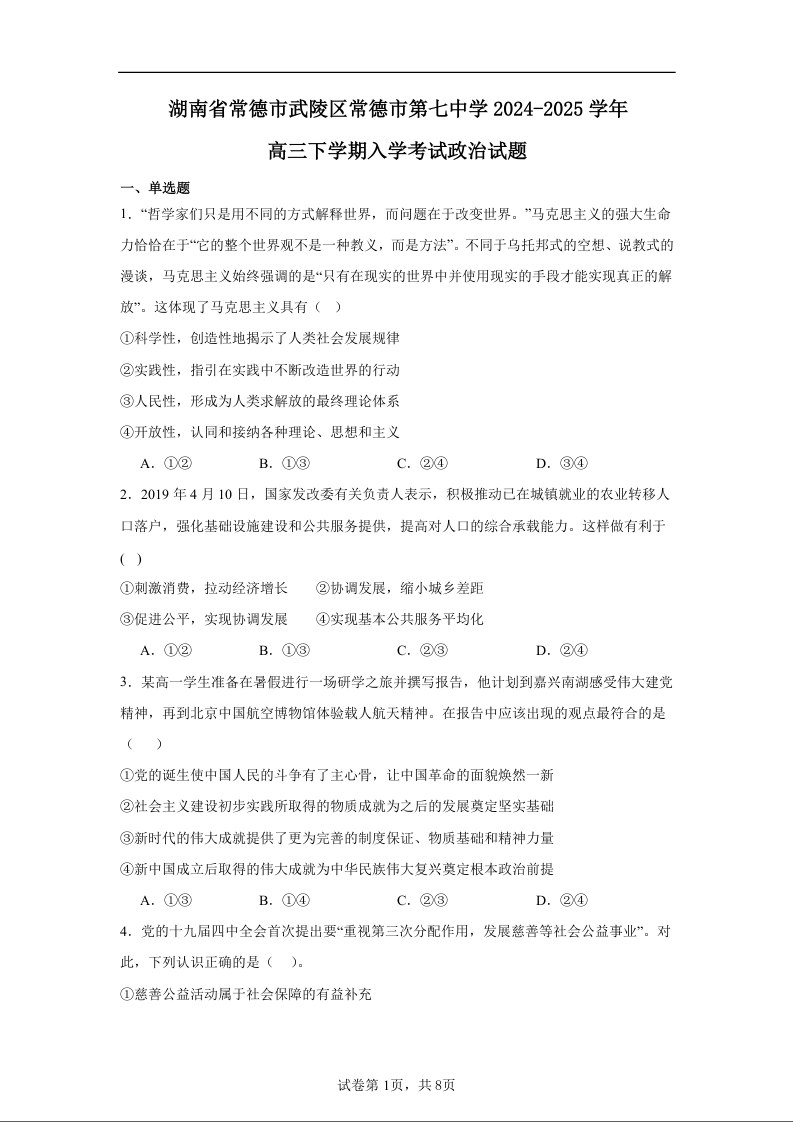 湖南省常德市第七中学2024-2025学年下学期高三开学考试政治+答案