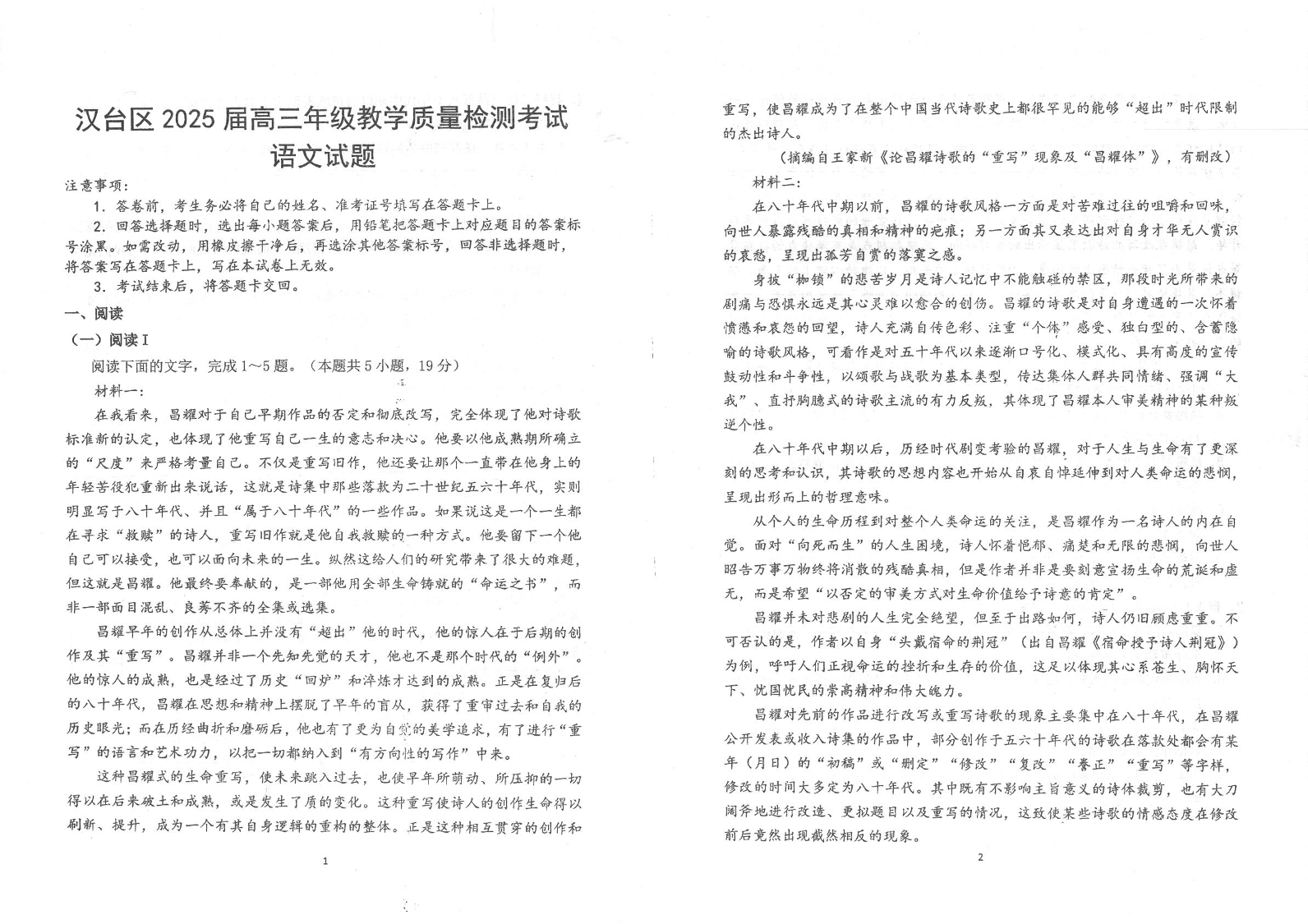 陕西省汉中市汉台区2024-2025学年下学期2月高三教学质量检测语文