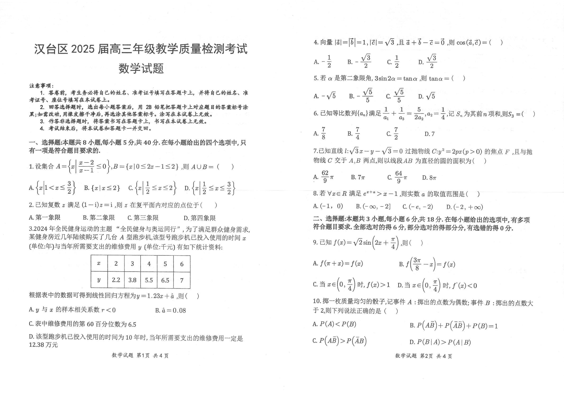 陕西省汉中市汉台区2024-2025学年下学期2月高三教学质量检测数学+答案