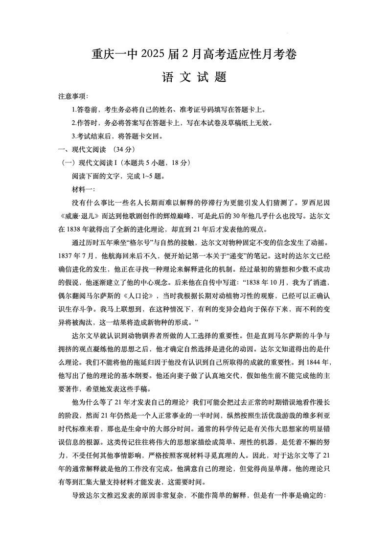 重庆市第一中学2024-2025学年下学期2月高三开学考试语文+答案