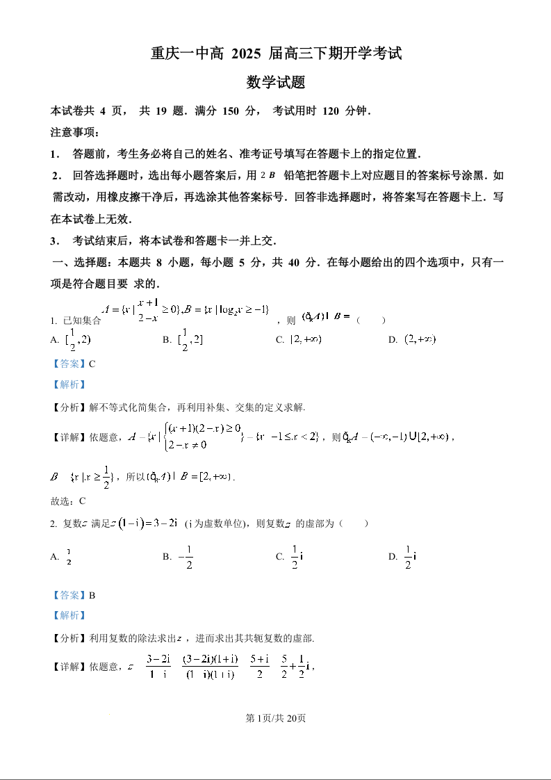 重庆市第一中学2024-2025学年下学期2月高三开学考试数学(精品解析版)