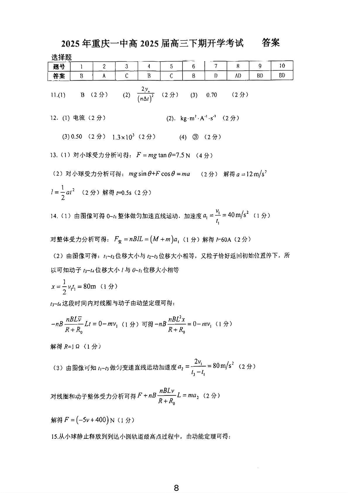 重庆市第一中学2024-2025学年下学期2月高三开学考试物理答案