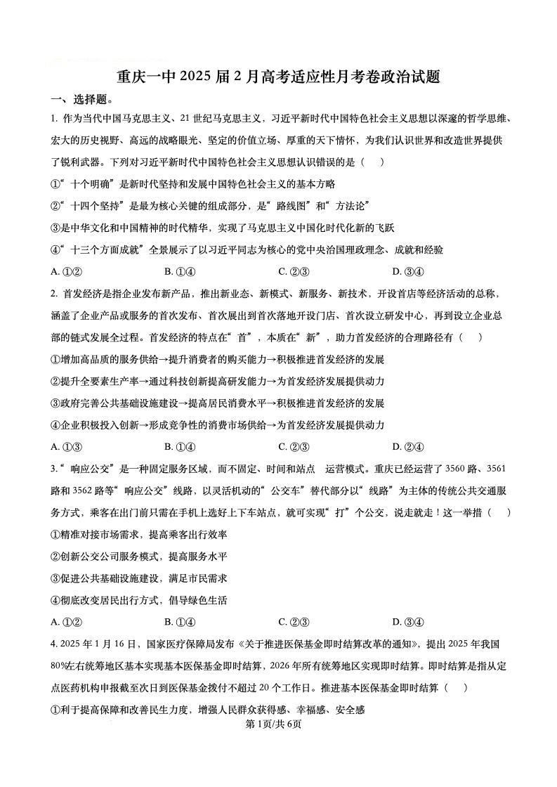 重庆市第一中学2024-2025学年下学期2月高三开学考试政治