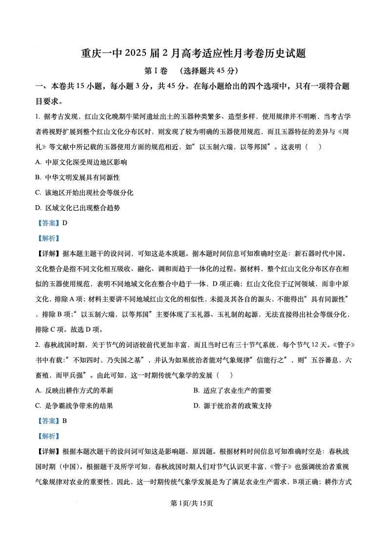重庆市第一中学2024-2025学年下学期2月高三开学考试历史答案