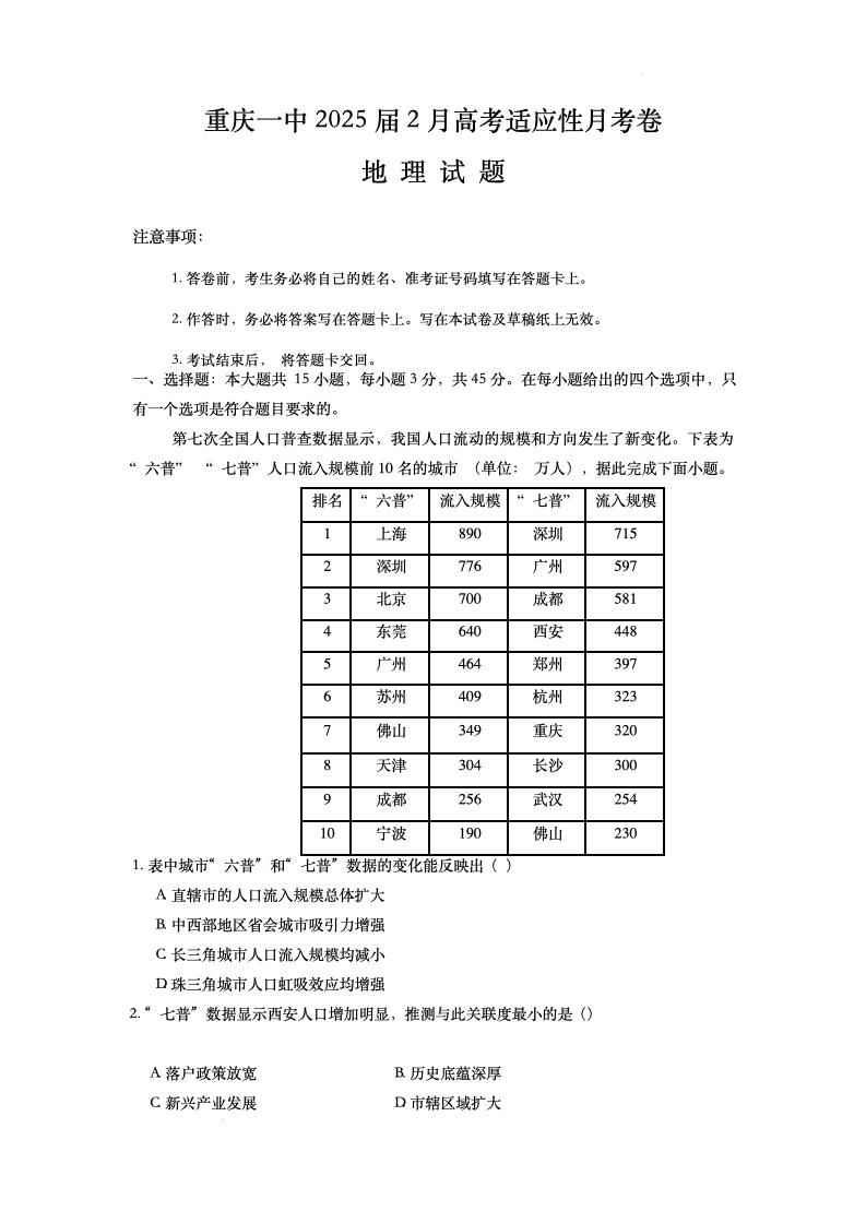 重庆市第一中学2024-2025学年下学期2月高三开学考试地理+答案