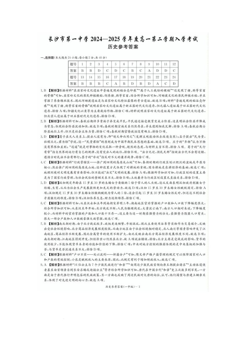湖南省长沙市第一中学2024-2025学年下学期高一入学考试历史答案