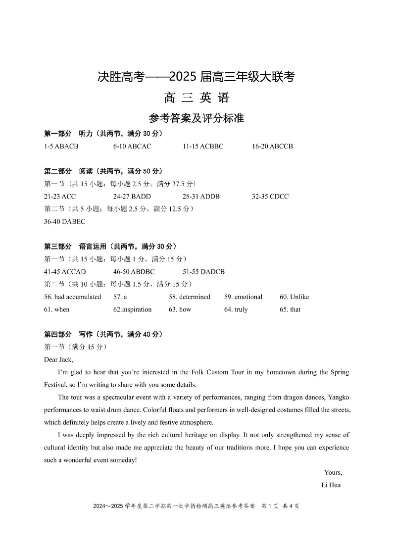 江苏省苏州市九校2024-2025学年下学期2月高三联考英语答案