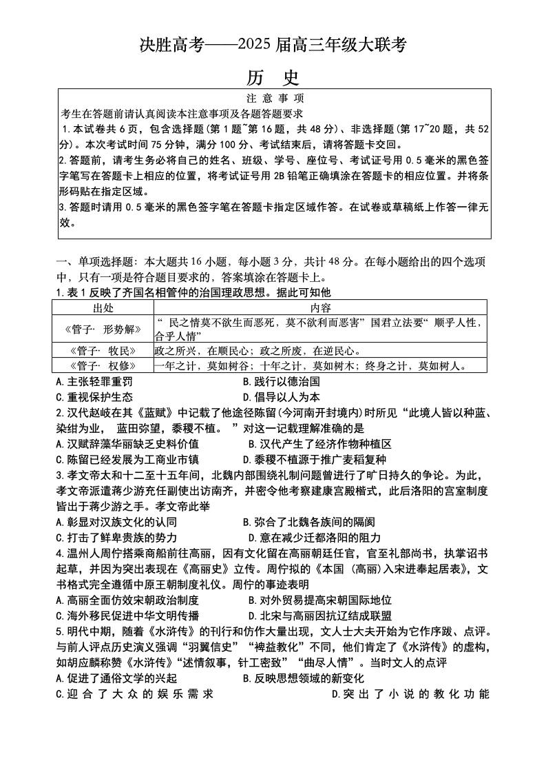 江苏省苏州市九校2024-2025学年下学期2月高三联考历史
