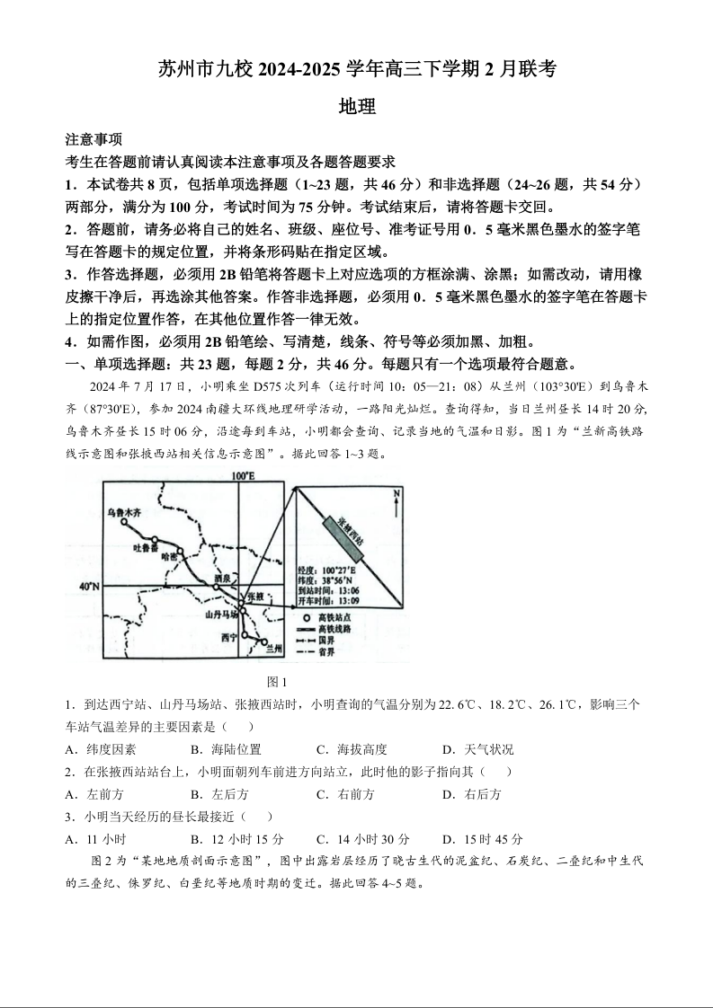 江苏省苏州市九校2024-2025学年下学期2月高三联考地理+答案