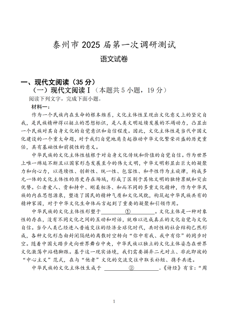 江苏省泰州市2024-2025届学年下学期2月高三开学调研测试语文