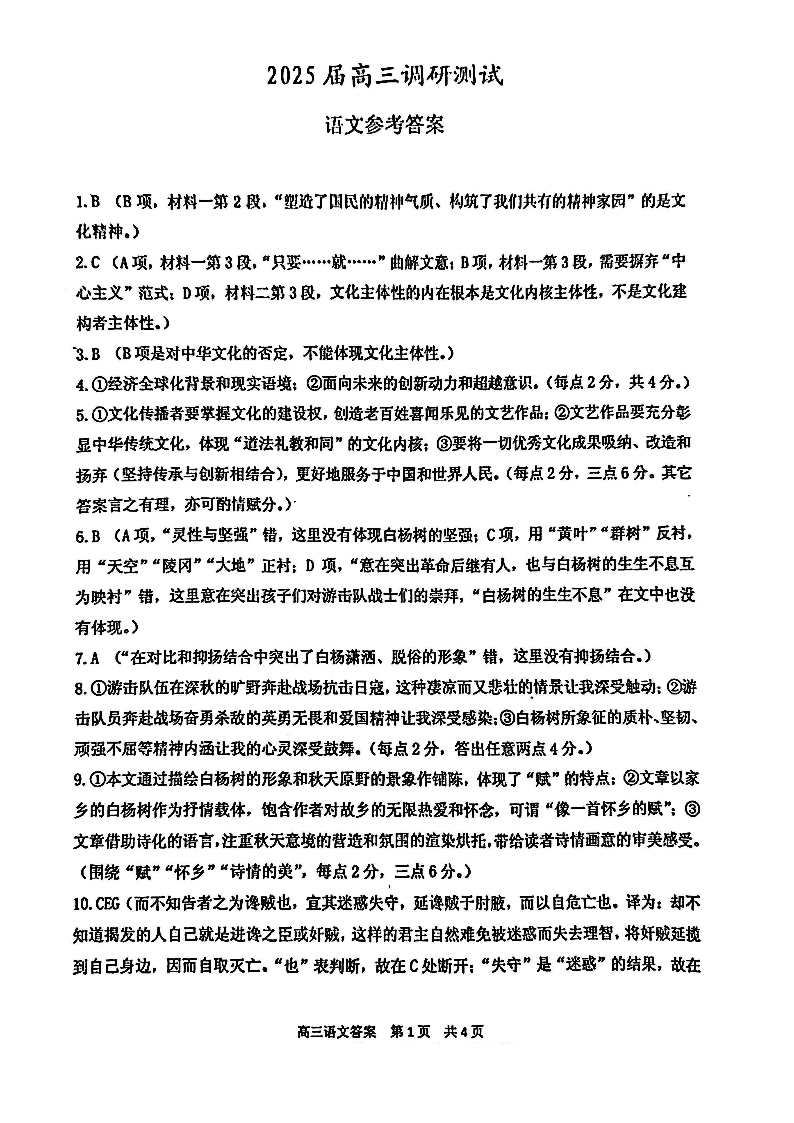 江苏省泰州市2024-2025届学年下学期2月高三开学调研测试语文答案