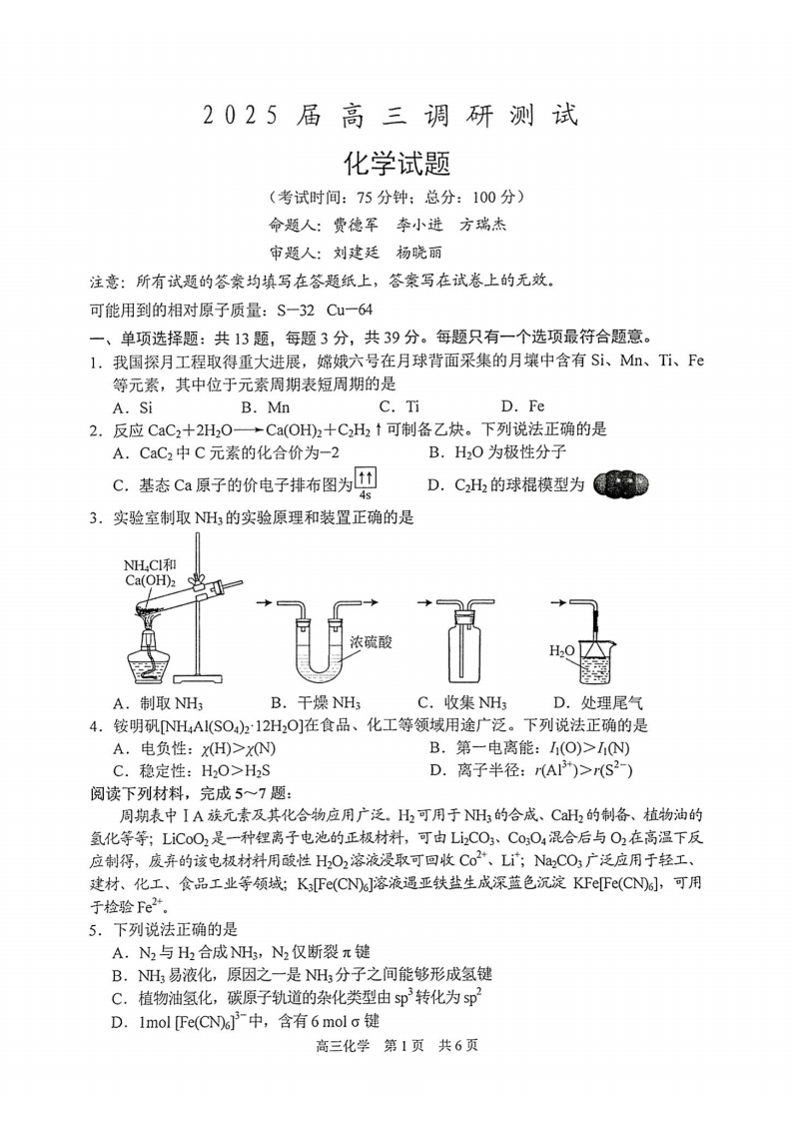 江苏省泰州市2024-2025届学年下学期2月高三开学调研测试化学