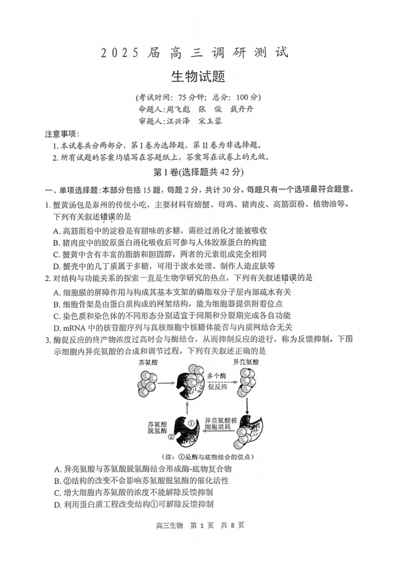 江苏省泰州市2024-2025届学年下学期2月高三开学调研测试生物