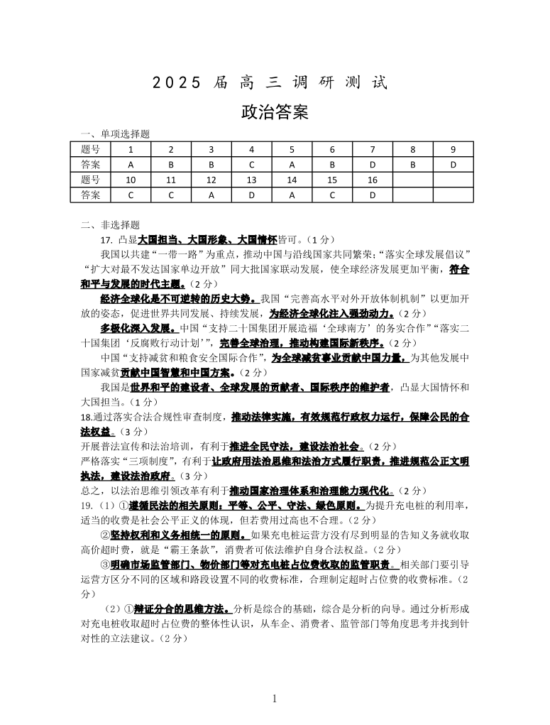 江苏省泰州市2024-2025届学年下学期2月高三开学调研测试政治答案