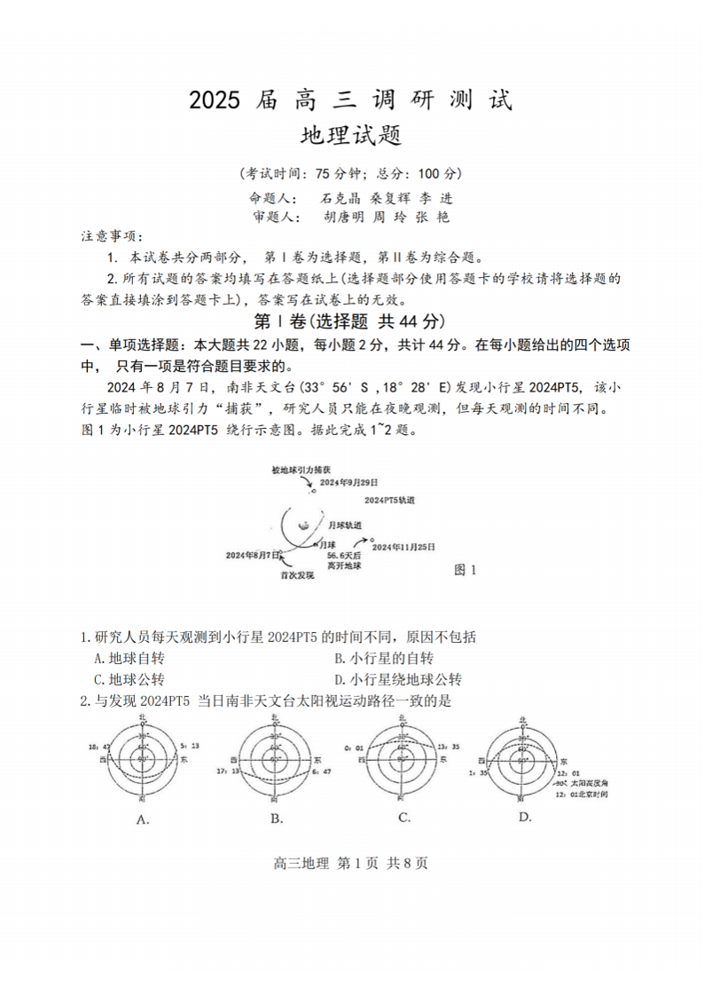 江苏省泰州市2024-2025届学年下学期2月高三开学调研测试地理