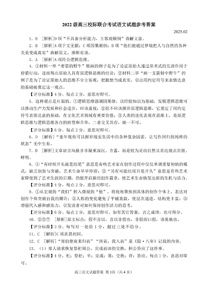 山东省日照市2024-2025学年下学期高三校际联合考试(一模)语文答案