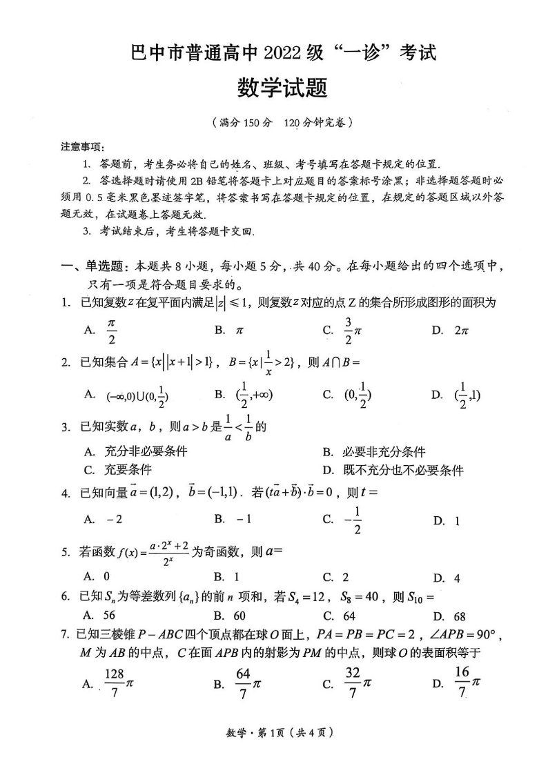 四川省巴中市2024-2025学年下学期高三一诊考试数学