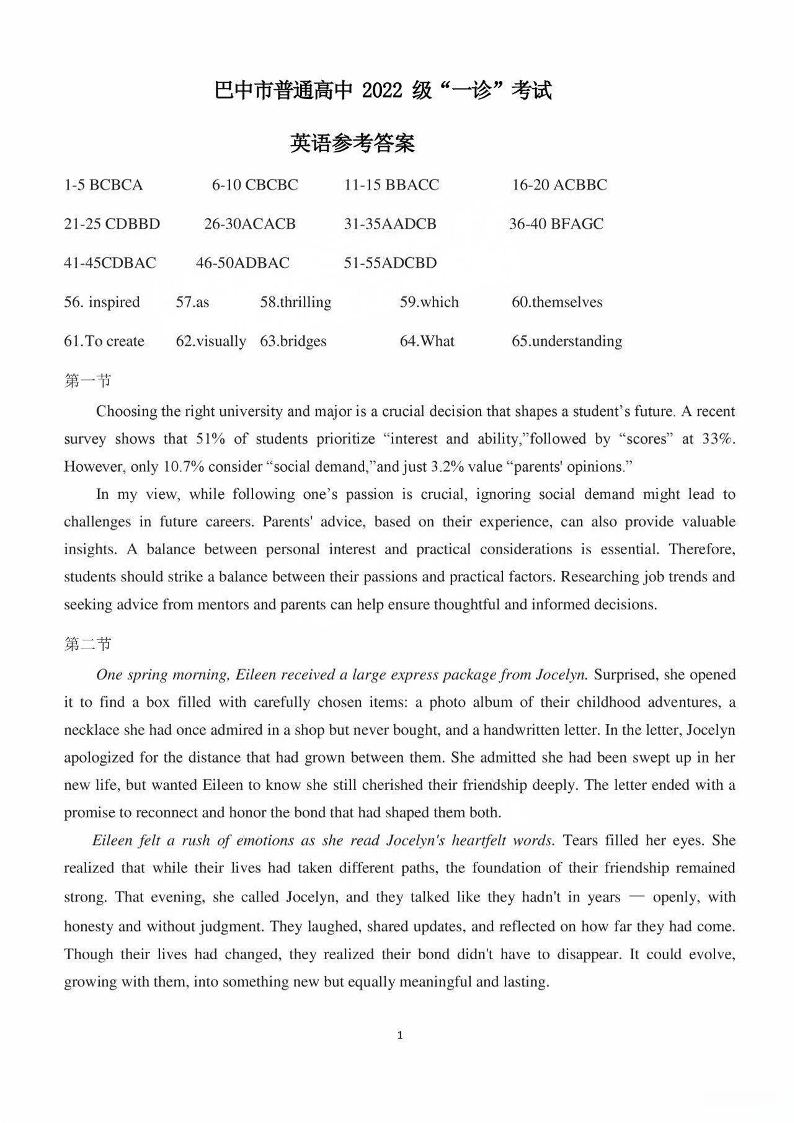 四川省巴中市2024-2025学年下学期高三一诊考试英语答案