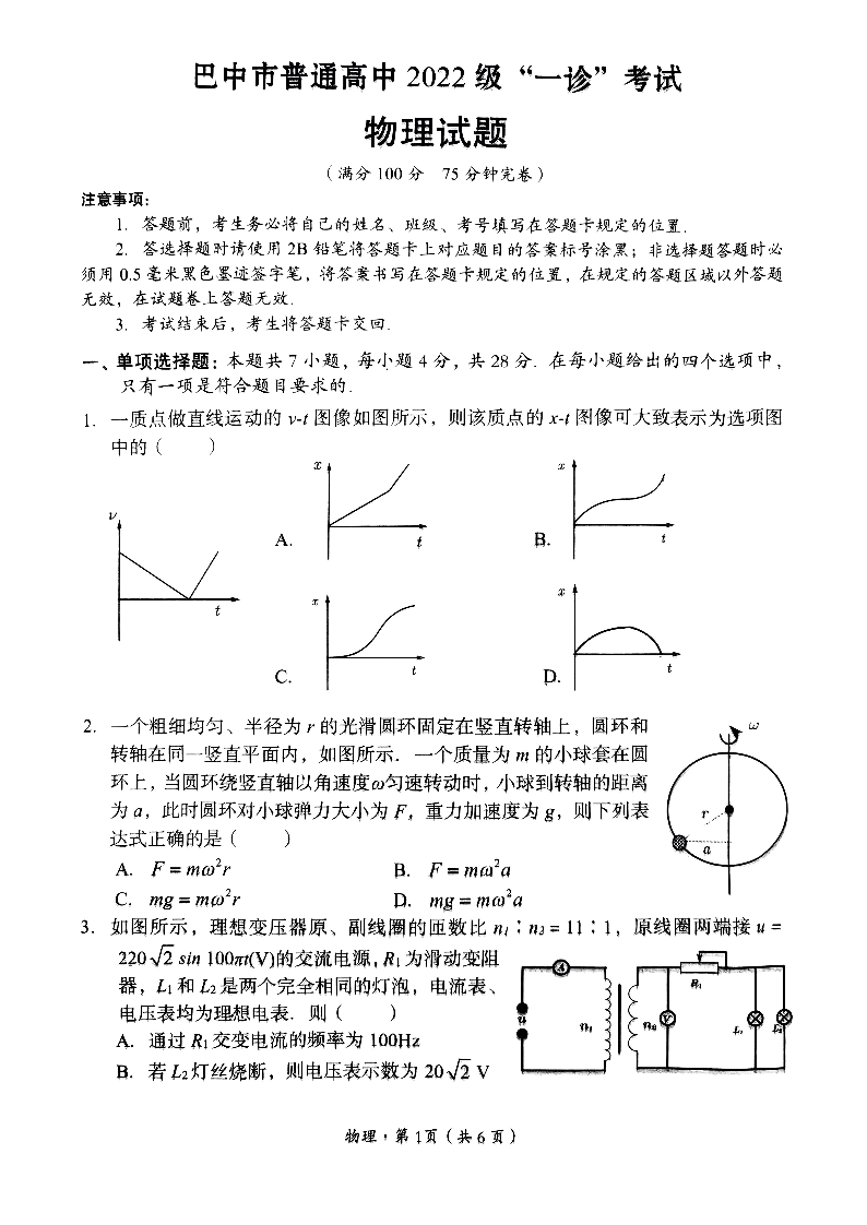 四川省巴中市2024-2025学年下学期高三一诊考试物理