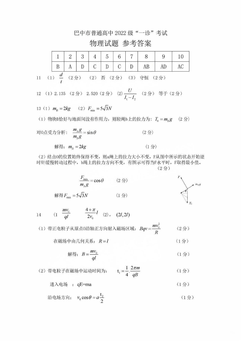 四川省巴中市2024-2025学年下学期高三一诊考试物理答案