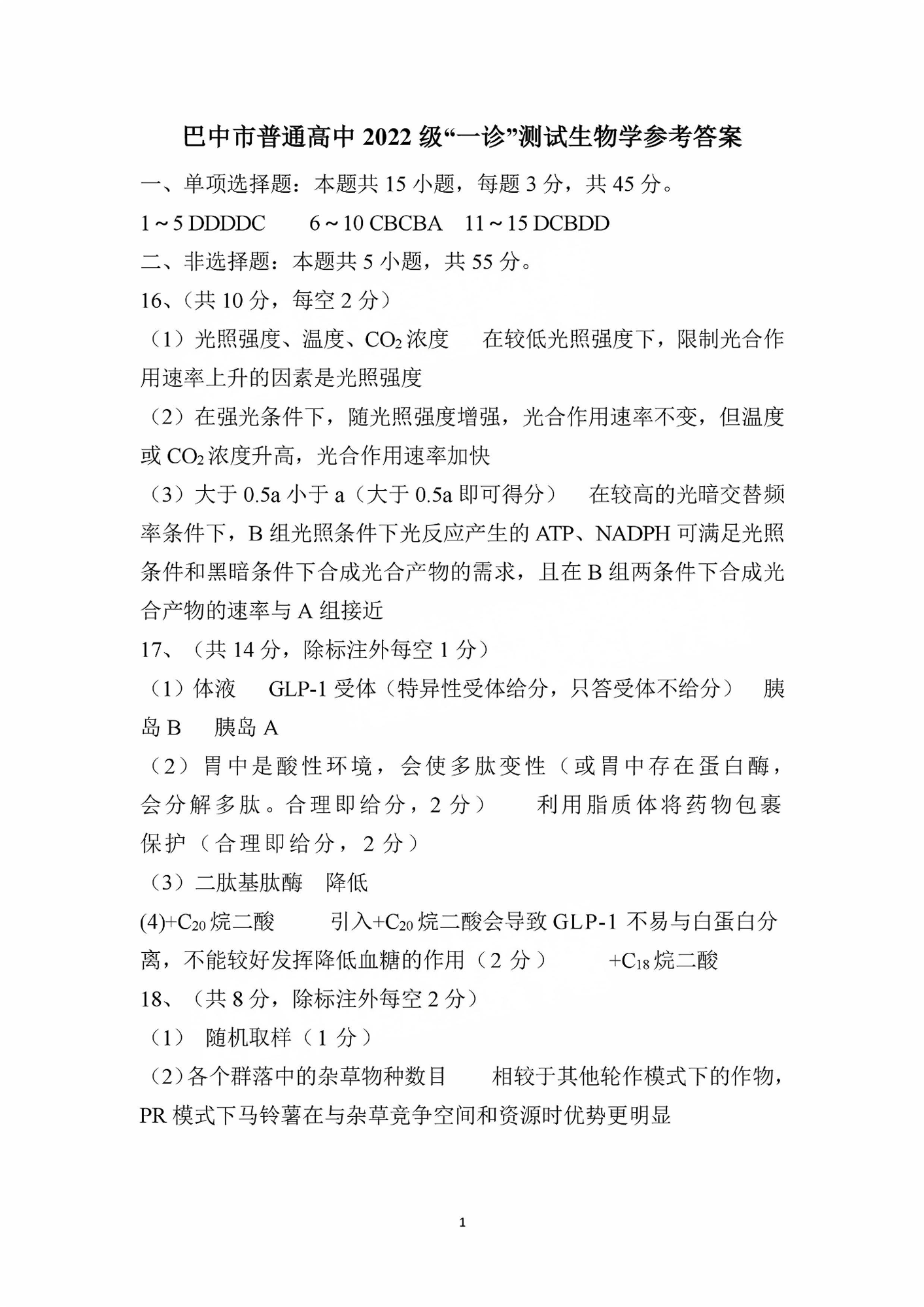 四川省巴中市2024-2025学年下学期高三一诊考试生物答案