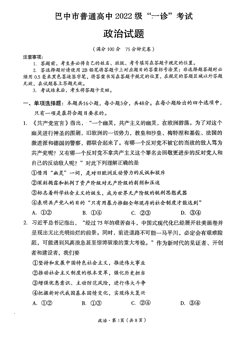 四川省巴中市2024-2025学年下学期高三一诊考试政治