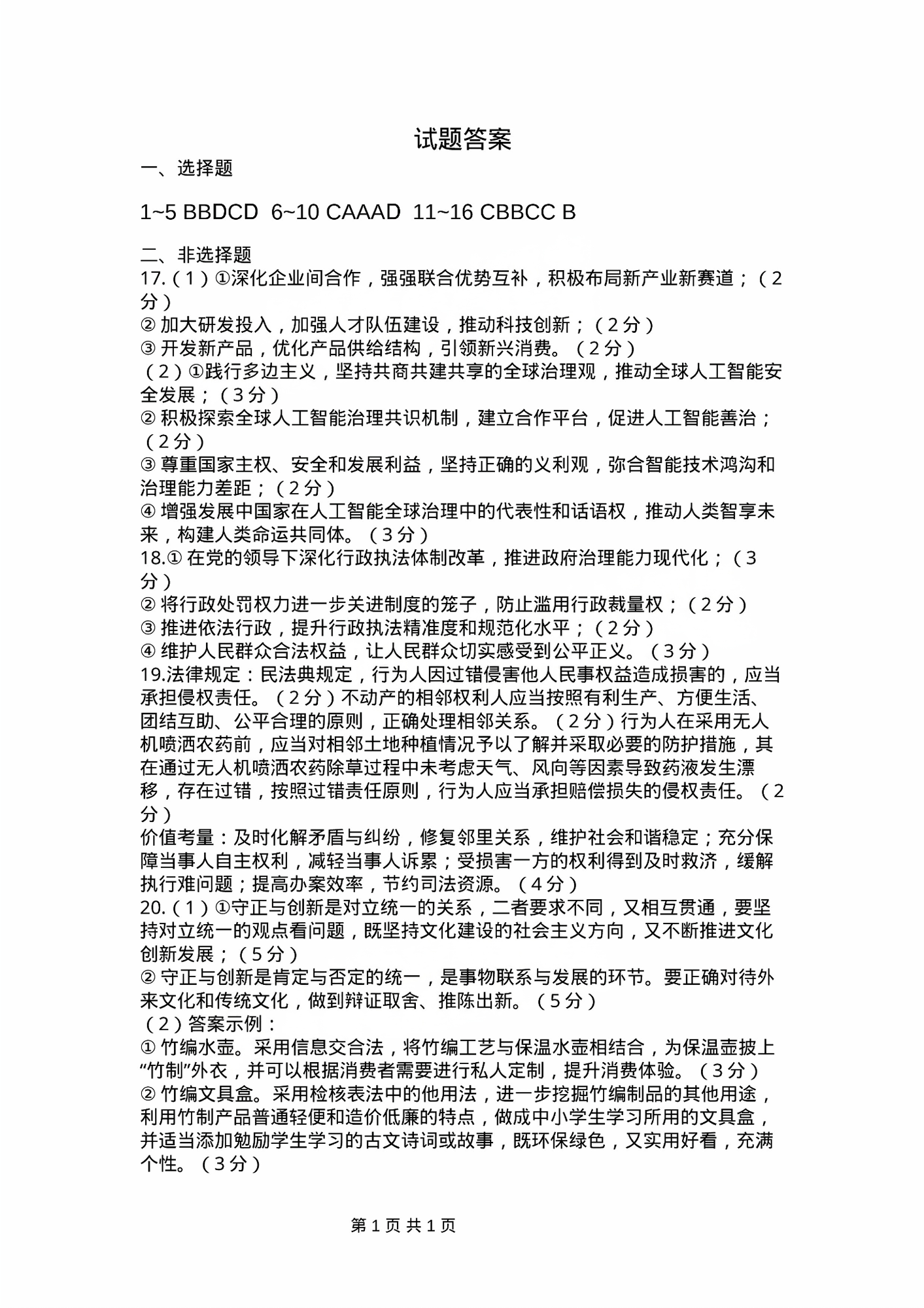 四川省巴中市2024-2025学年下学期高三一诊考试政治答案