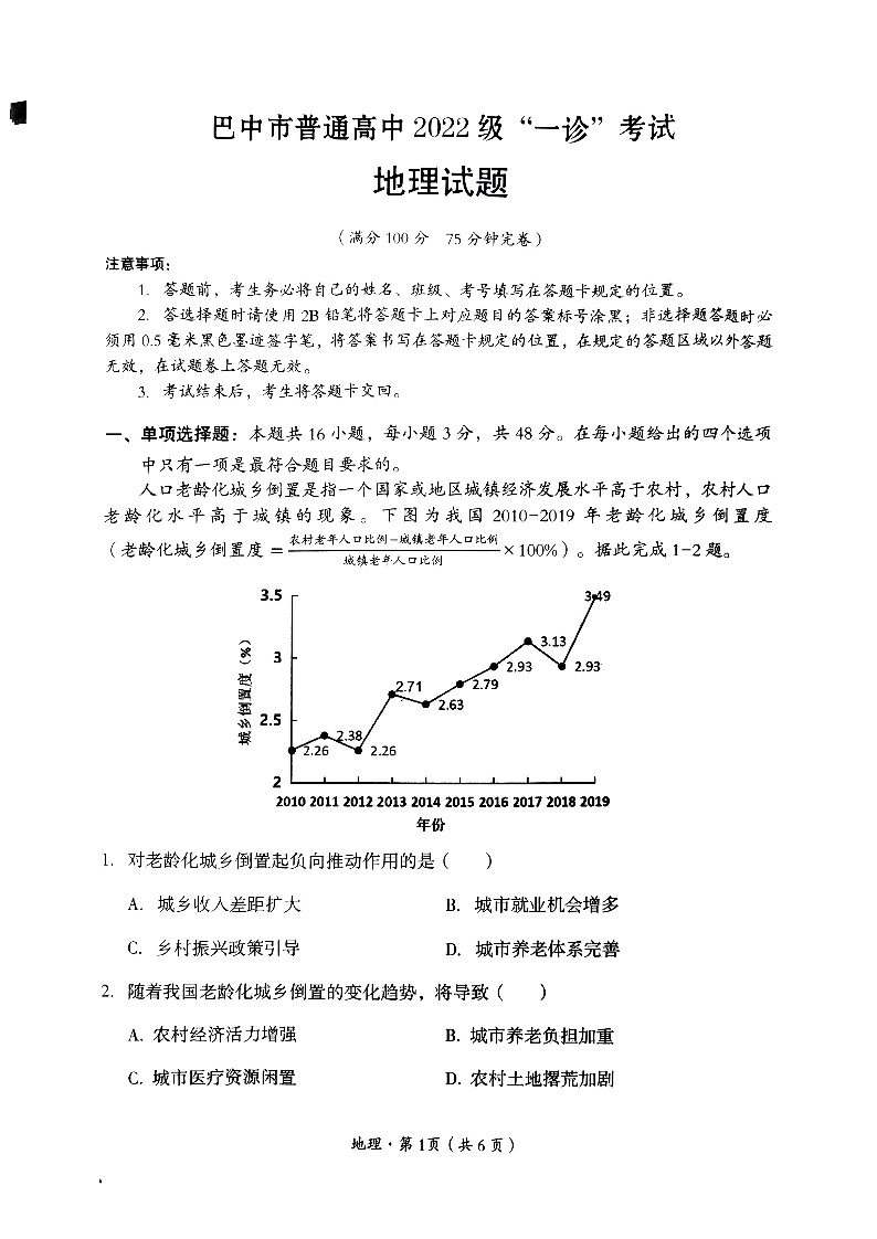 四川省巴中市2024-2025学年下学期高三一诊考试地理