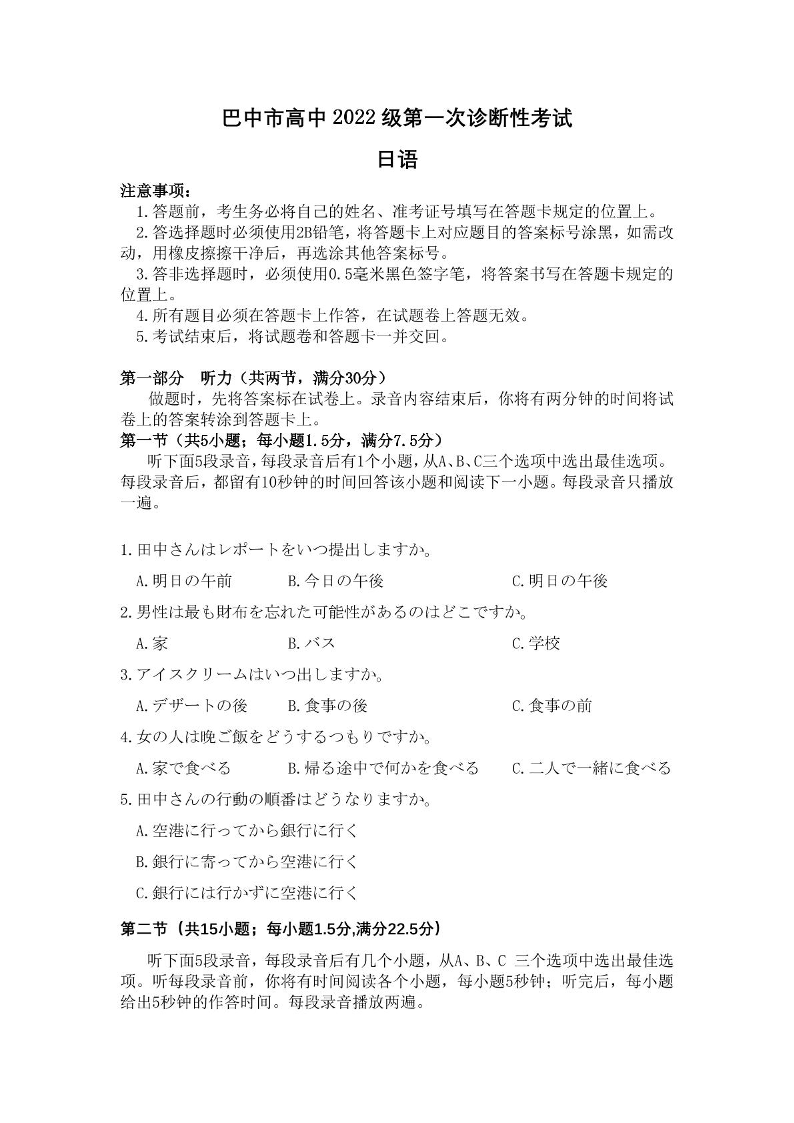 四川省巴中市2024-2025学年下学期高三一诊考试日语