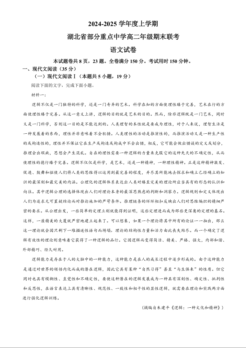 湖北省部分重点中学2024-2025学年上学期1月高二期末联考语文+答案