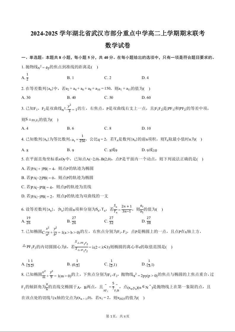 湖北省部分重点中学2024-2025学年上学期1月高二期末联考数学+答案