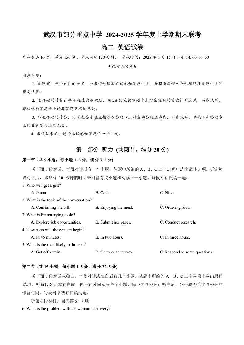 湖北省部分重点中学2024-2025学年上学期1月高二期末联考英语+答案