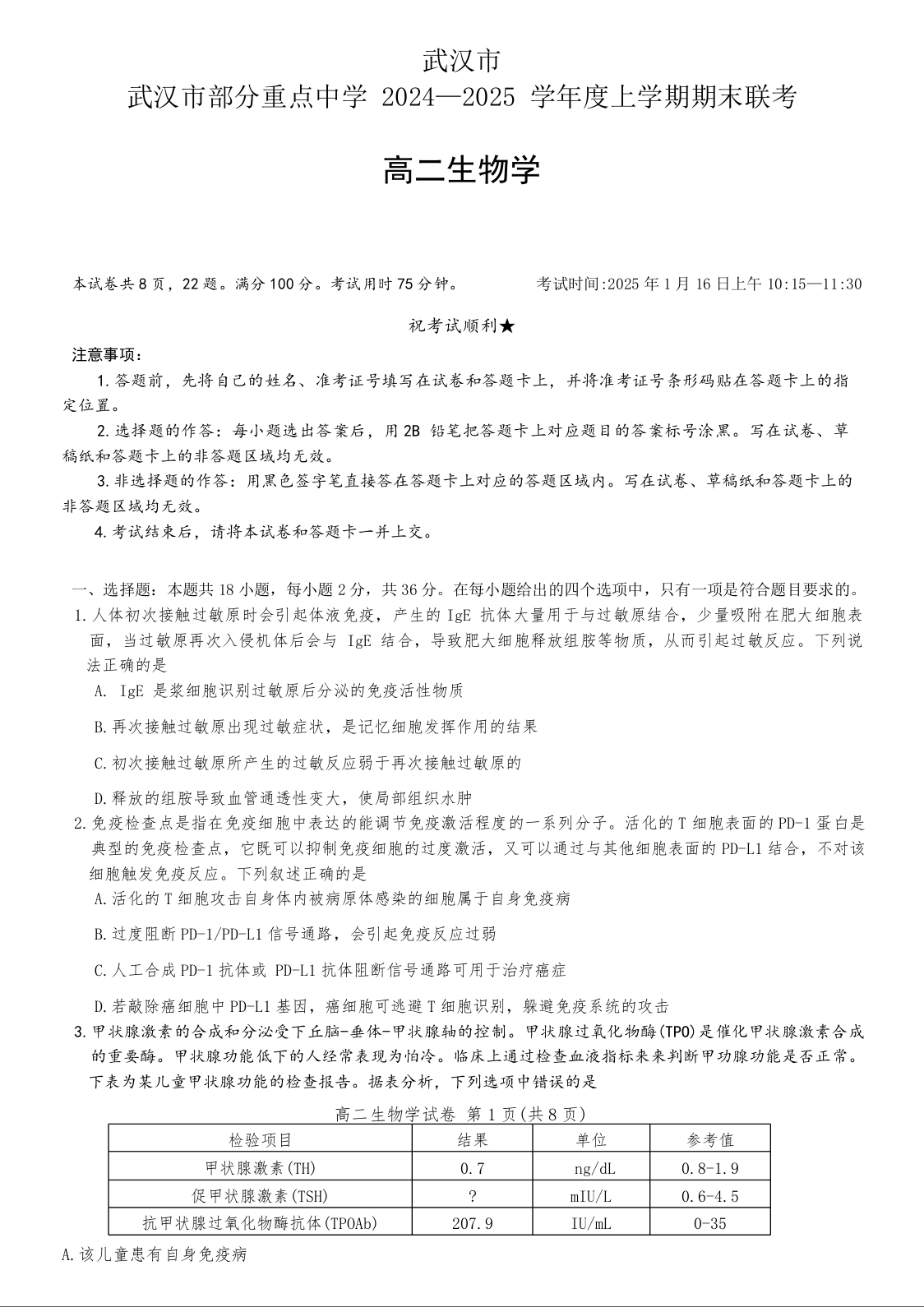 湖北省部分重点中学2024-2025学年上学期1月高二期末联考生物