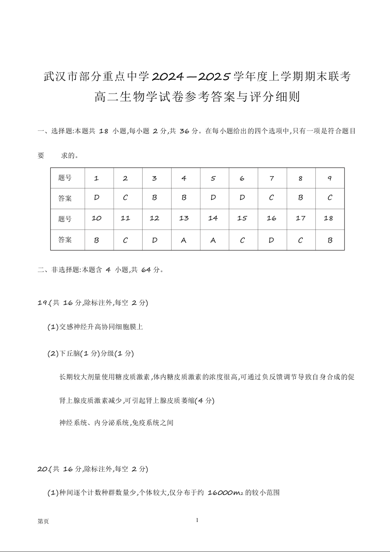 湖北省部分重点中学2024-2025学年上学期1月高二期末联考生物答案