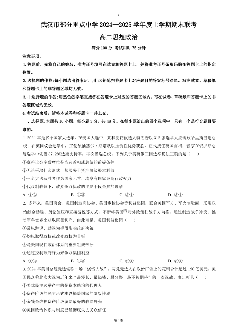 湖北省部分重点中学2024-2025学年上学期1月高二期末联考政治+答案