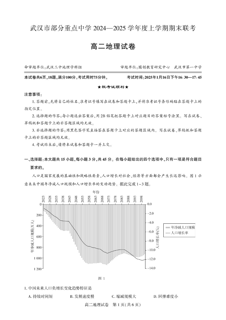 湖北省部分重点中学2024-2025学年上学期1月高二期末联考地理