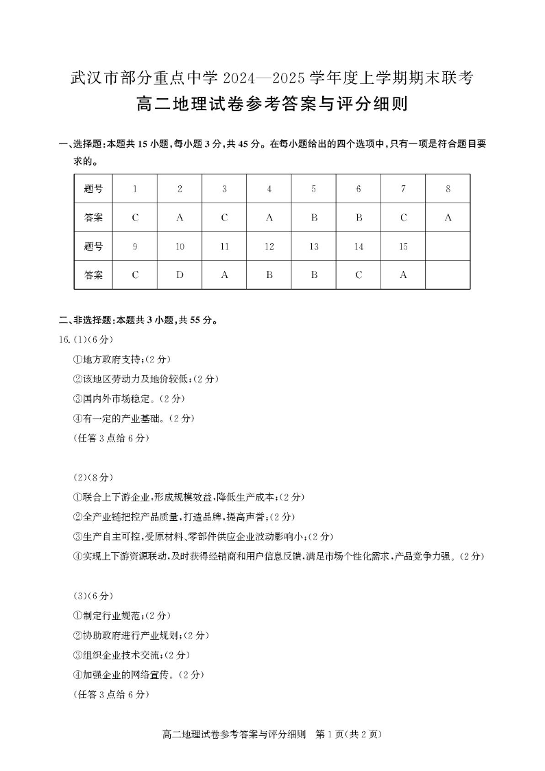 湖北省部分重点中学2024-2025学年上学期1月高二期末联考地理答案