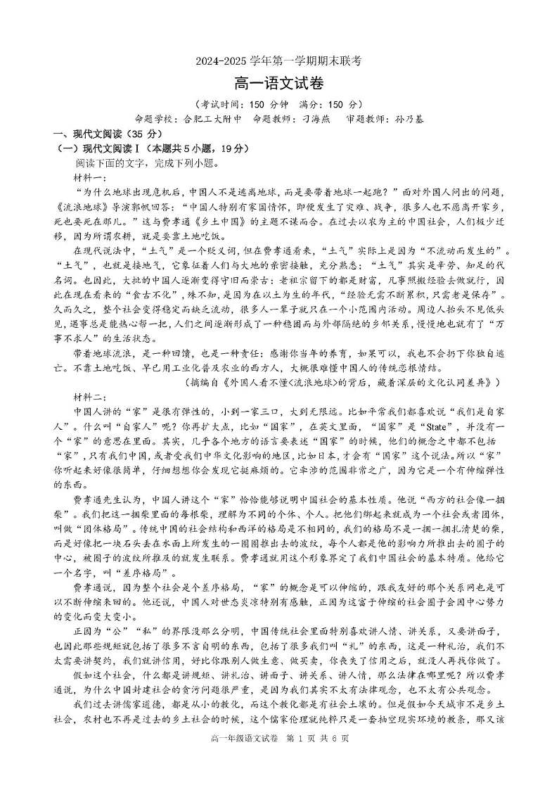 安徽省合肥市六校联盟2024-2025学年上学期高一1月期末考试语文