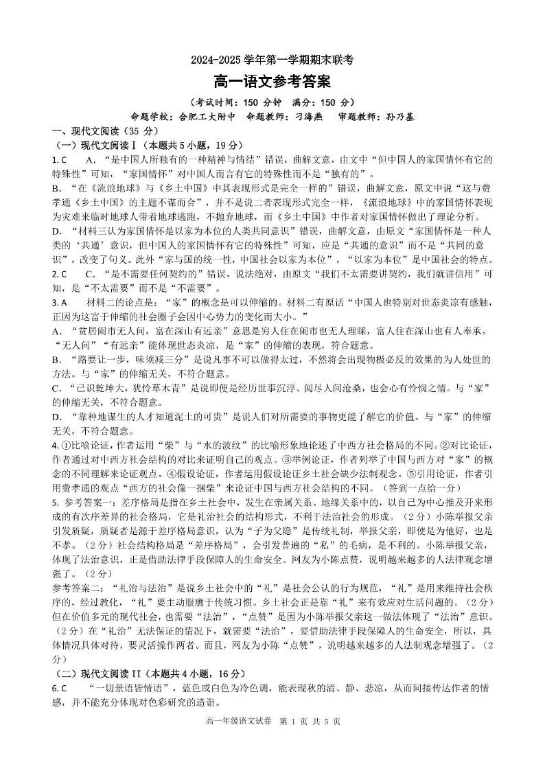 安徽省合肥市六校联盟2024-2025学年上学期高一1月期末考试语文答案