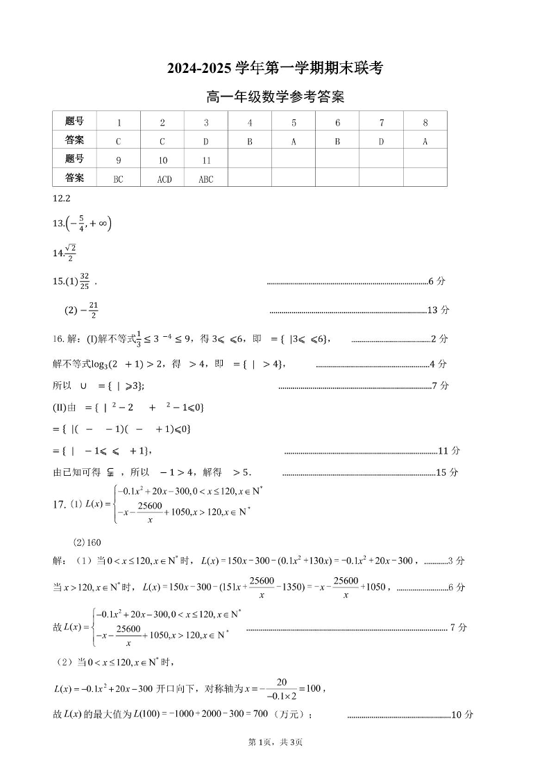 安徽省合肥市六校联盟2024-2025学年上学期高一1月期末考试数学答案