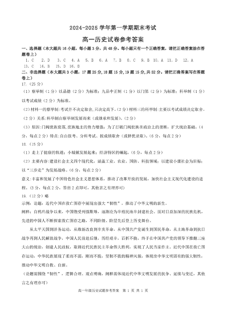 安徽省合肥市六校联盟2024-2025学年上学期高一1月期末考试历史答案