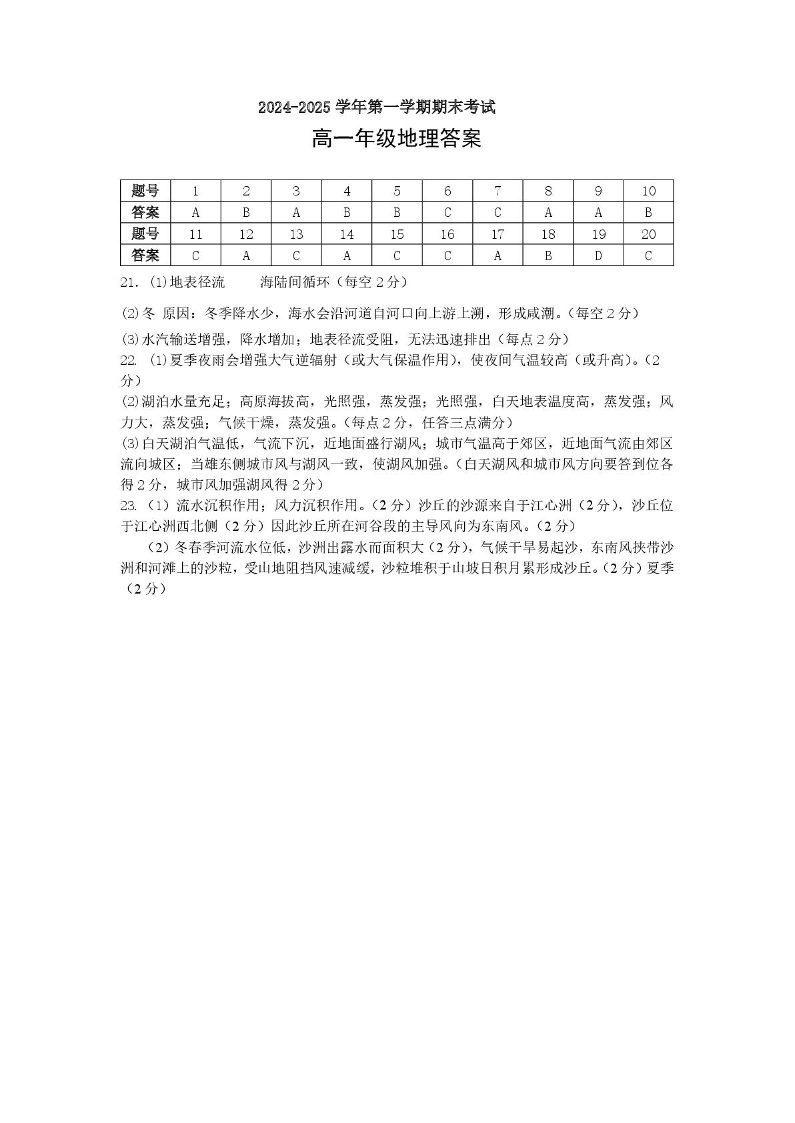 安徽省合肥市六校联盟2024-2025学年上学期高一1月期末考试地理答案