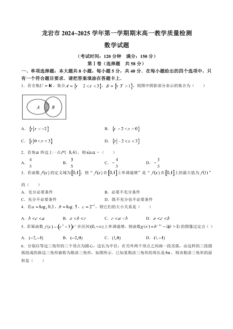 福建省龙岩市2024-2025学年上学期1月高一期末考试数学+答案