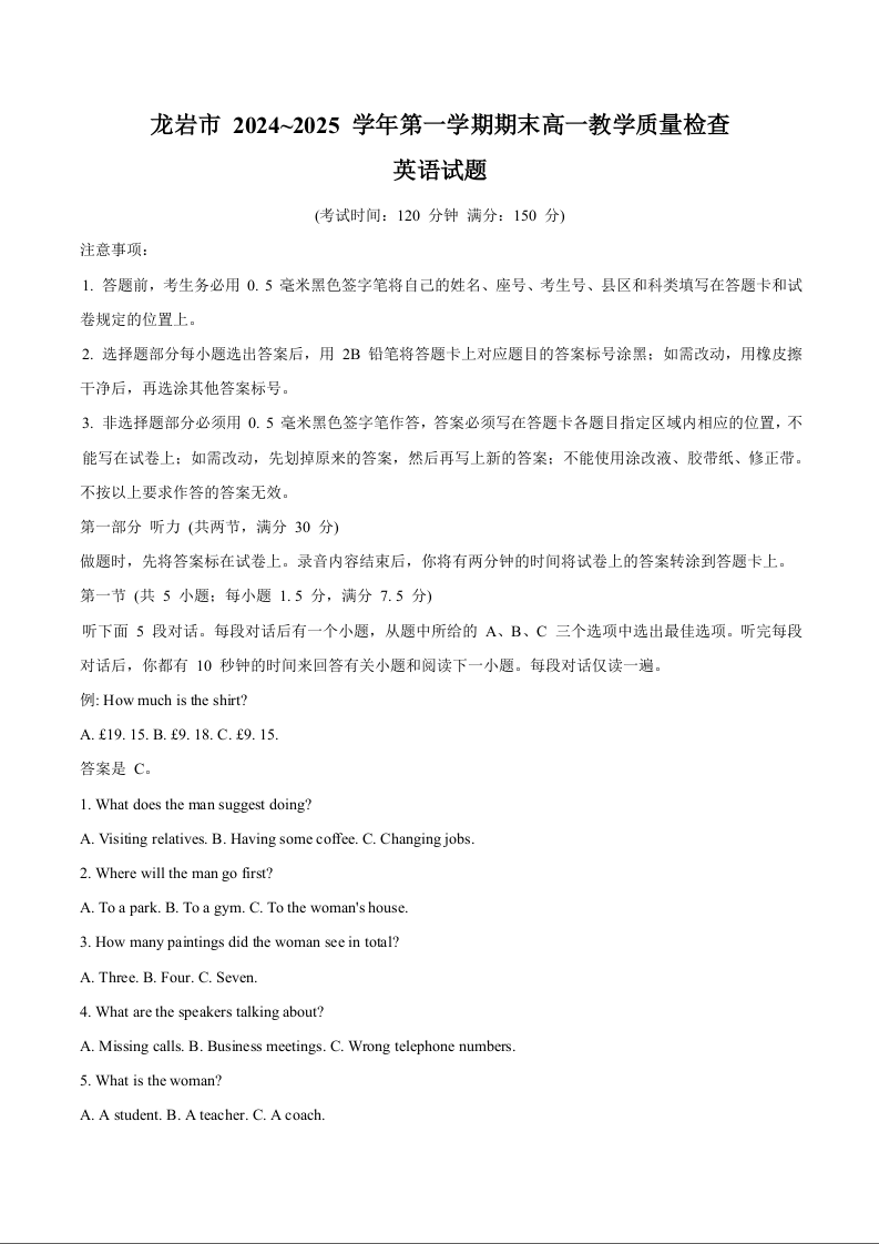 福建省龙岩市2024-2025学年上学期1月高一期末考试英语+答案