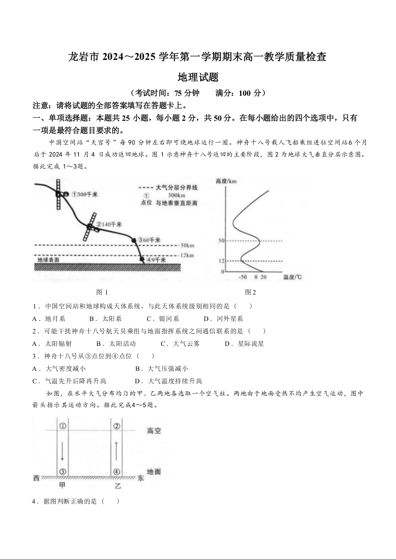 福建省龙岩市2024-2025学年上学期1月高一期末考试地理+答案