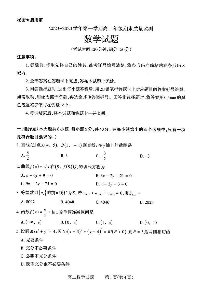 山西省大同市2023-2024学年高二上学期期末质量监测数学+答案